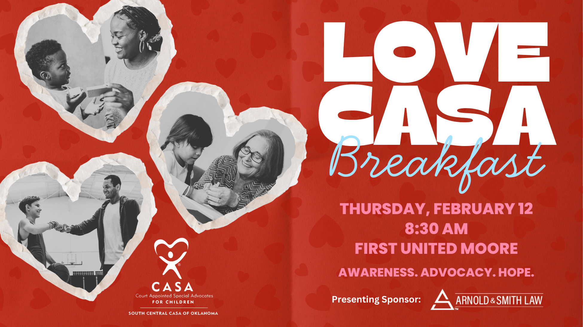 Join us for a meaningful morning as we support children in foster care and make a lasting impact in Cleveland, Garvin, and McClain Counties. The LOVE CASA Breakfast will be held on Thursday, February 12, from 8:30 to 10:00 AM (doors open at 8:00 AM) at First United Bank in Moore (420 SW 6th St.) Enjoy a complimentary breakfast, hear updates about CASA’s work, and learn how to get involved through volunteering, advocacy, or giving. Can’t attend? Consider a $25 gift to support South Central CASA, even from afar.