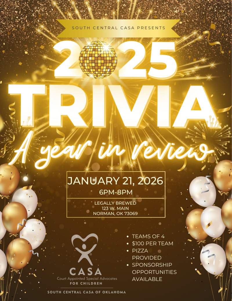 Test your 2025 trivia knowledge and join South Central CASA on Wednesday, January 21, from 6–8 PM at Legally Brewed. From pop culture to current events, we’ll be putting your memory of 2025 to the test. Your participation helps raise funds so that CASA volunteers can advocate for children in foster care across Cleveland, Garvin, and McClain Counties. Gather a team of four and get ready for a fun night of friendly competition for a great cause!